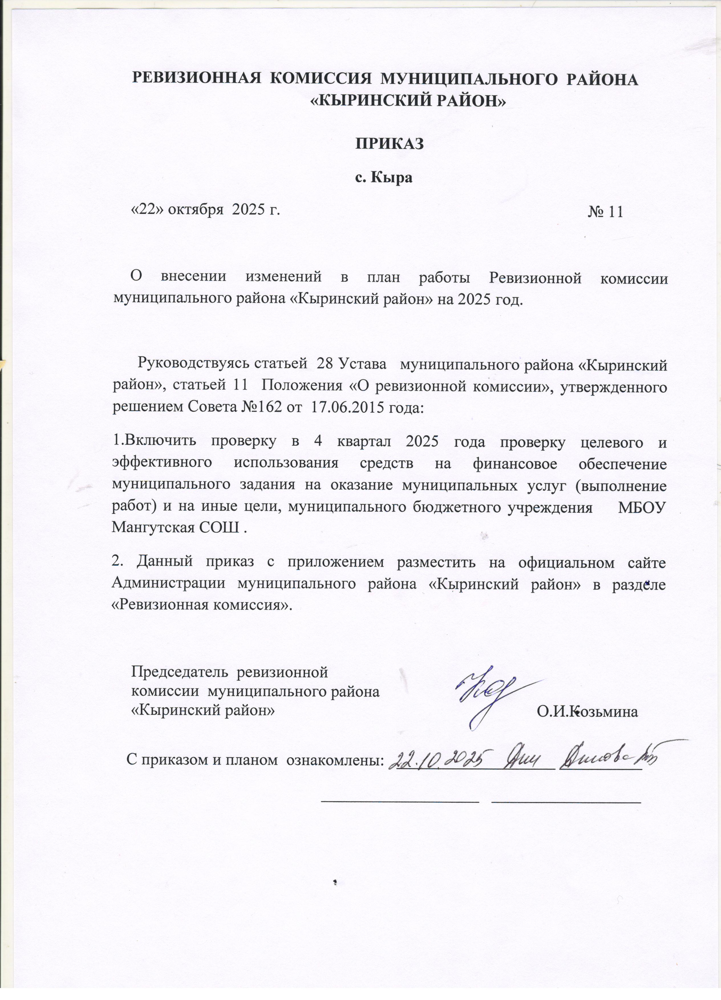 Приказ о внесении изменений в плана работы ревизионной комиссии муниципального района "Кыринский район" на 2025 год
