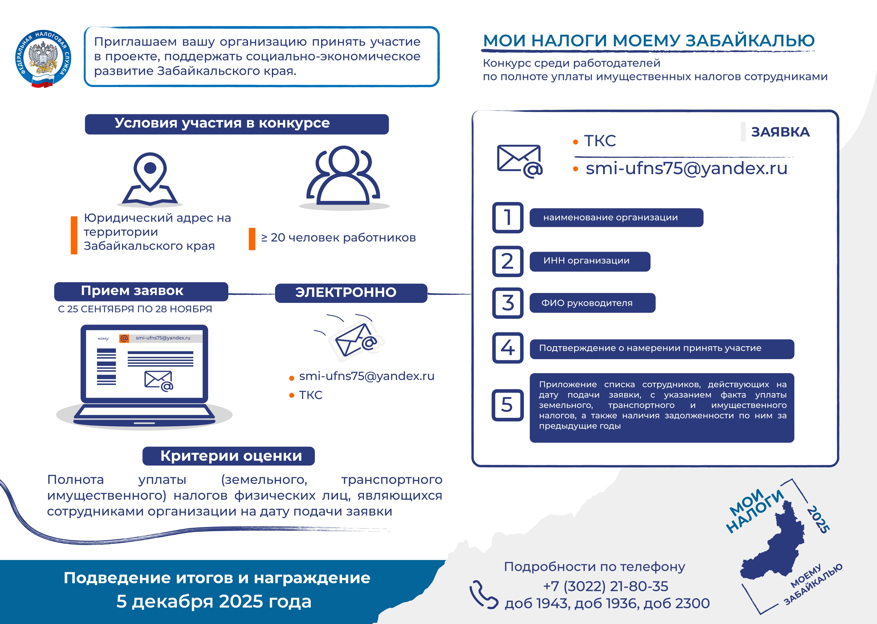 До 28 ноября организации любой формы собственности Забайкальского края, имеющие адрес места нахождения на территории региона, с численностью работников не менее 20 человек, могут подать заявки на конкурс «Мои налоги – моему Забайкалью».